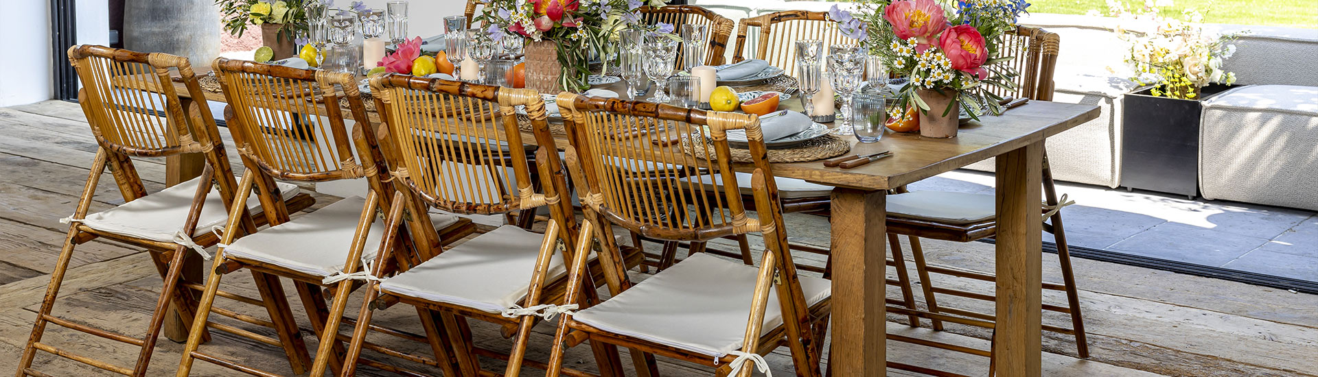 Table rectangulaire effet bois × chaises au cannage naturel : ambiance bohème raffinée, idéale en intérieur comme sous tente.