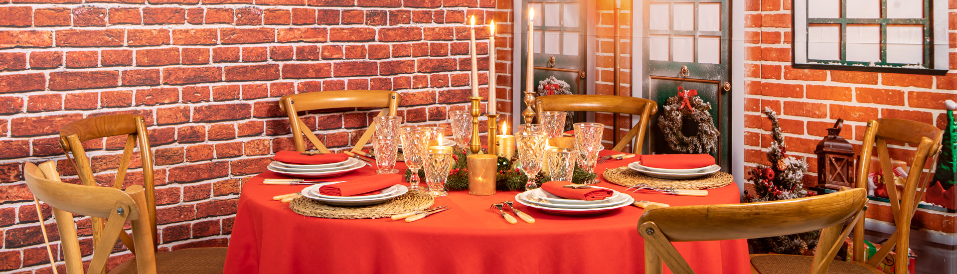 Ici, nous optons pour les couleurs rouges et or. D’abord, nous étendons une nappe toile de Jouy brique, sur laquelle nous dressons les assiettes Luxor, ce joli modèle au liseré or. Nous rappelons d’ailleurs ce détail en préférant les verres Marquis or.