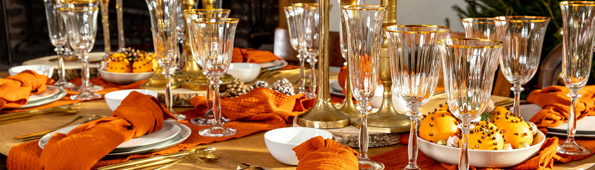 Cette année, nous conseillons les couleurs rouges et or. D’abord, étendre une nappe toile de Jouy brique, sur laquelle dresser les assiettes Luxor, ce joli modèle au liseré or. Nous conseillons d’ailleurs ce détail en préférant les verres Marquis or.